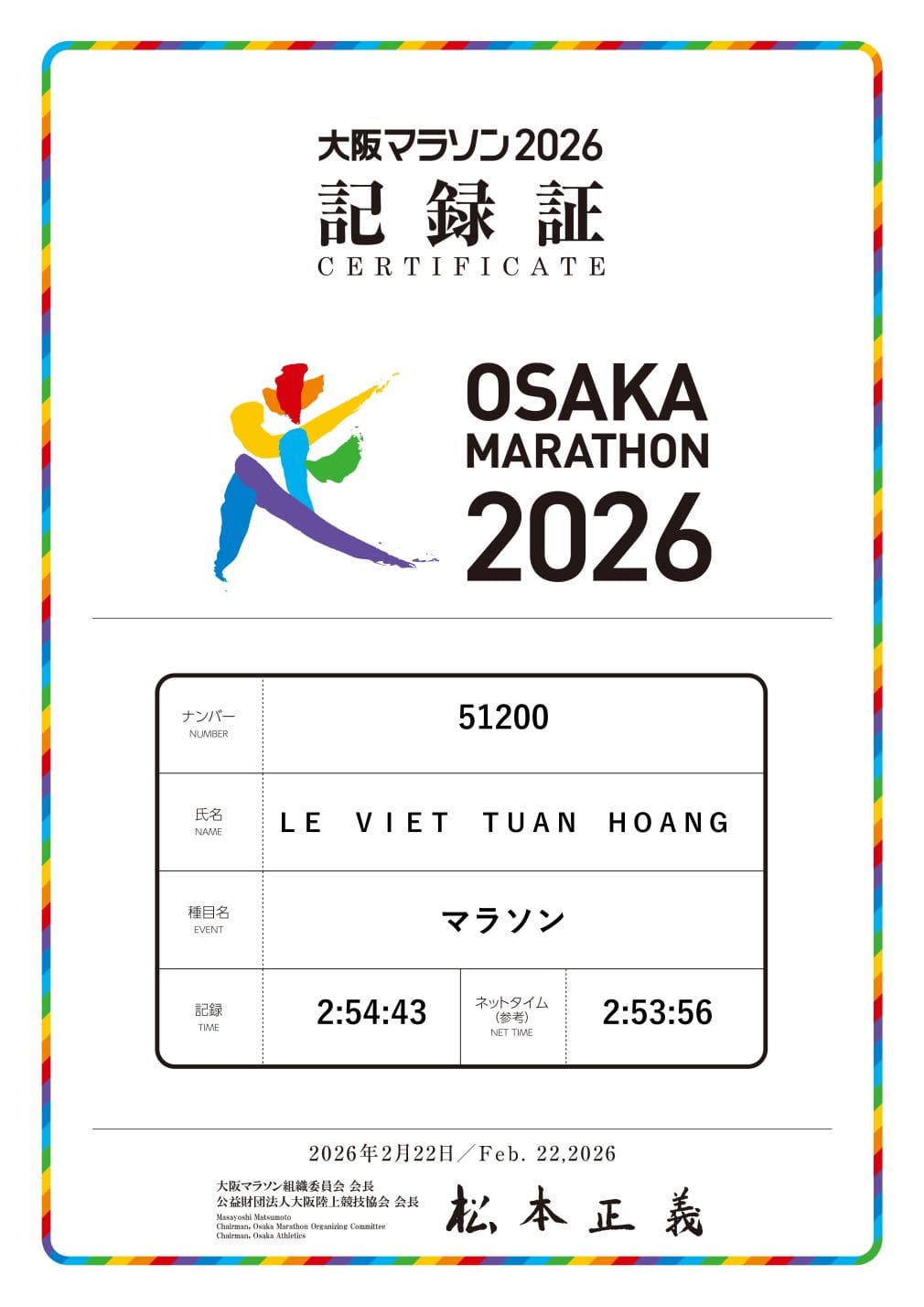 Kết thúc giải Osaka Marathon 2026, tôi nhận ra mình đã chạy marathon được 8 giải. Chuỗi PB vẫn tiếp tục và đây là PB với Sub3 lần thứ 3 liên tiếp của tôi kể từ lần đầu đạt Sub3 ở Seoul Marathon 2025. Nhưng điều quan trọng nhất với tôi lúc này thật ra lại không phải là thành tích, mà chính ở tình yêu đối với thể thao, với việc tập luyện thể thao dài hạn. Việc đạt được thành tích tốt hơn chỉ giúp chúng ta hạnh phúc hơn, tự hào hơn sau những ngày tháng tập luyện vất vả.