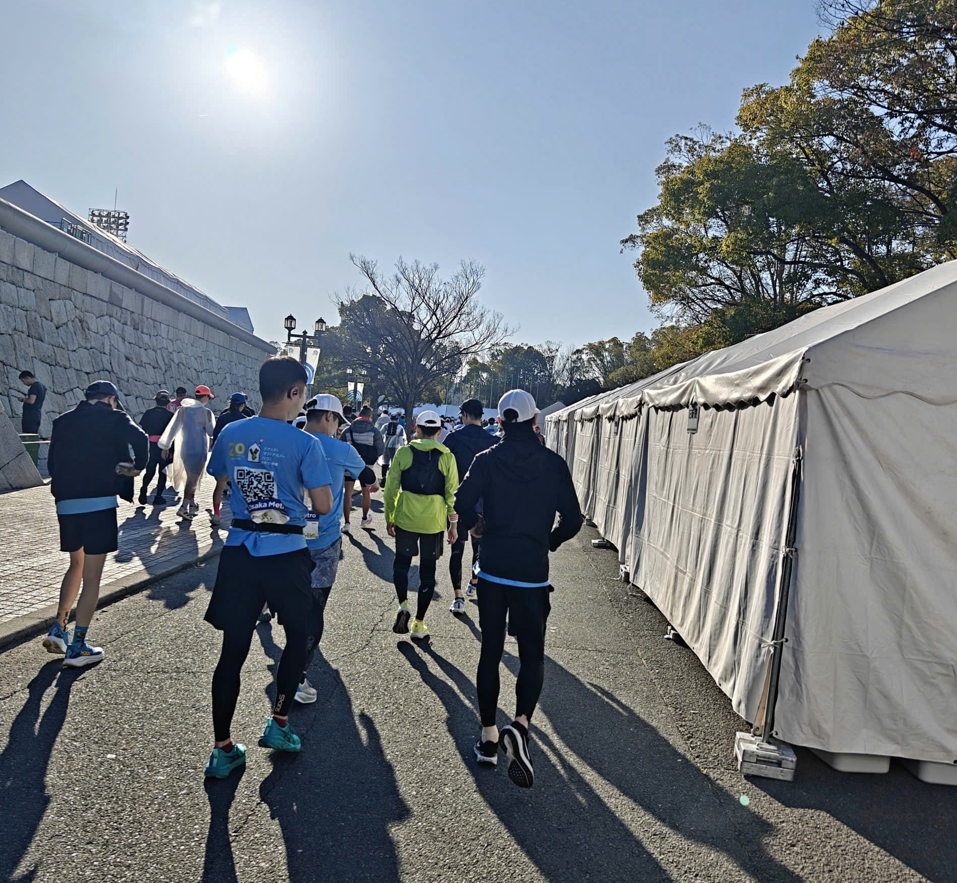 Tôi và a Giang chia tay nhau ở lối vào khu gửi đồ. Tôi tới bàn nước dành cho vđv được bố trí ở ngay lối vào đường dẫn ra khu vực xuất phát (dài cỡ 1.5km từ điểm đó tới start line). Đi qua khu vực này tới khu "Plum Garden" (Vườn Mận) thì tôi thấy hơi nhâm nhẩm đau bụng, cảm giác không ổn tẹo nào nên ... để đảm bảo không gặp bất kỳ sự cố nào, tôi xếp hàng theo đám đông vào khu vệ sinh công cộng. Phía trước tôi là một hàng dài vđv dễ đến cả trăm người. Trong lúc chờ đợi, tôi đếm số vđv phía trước và ... làm toán 😂 Tính xem mỗi người mất bao nhiêu thời gian và nếu đến lượt mình thì sẽ là khoảng mấy giờ, và liệu như vậy thì có bị muộn giờ xuất phát hay không 😂
